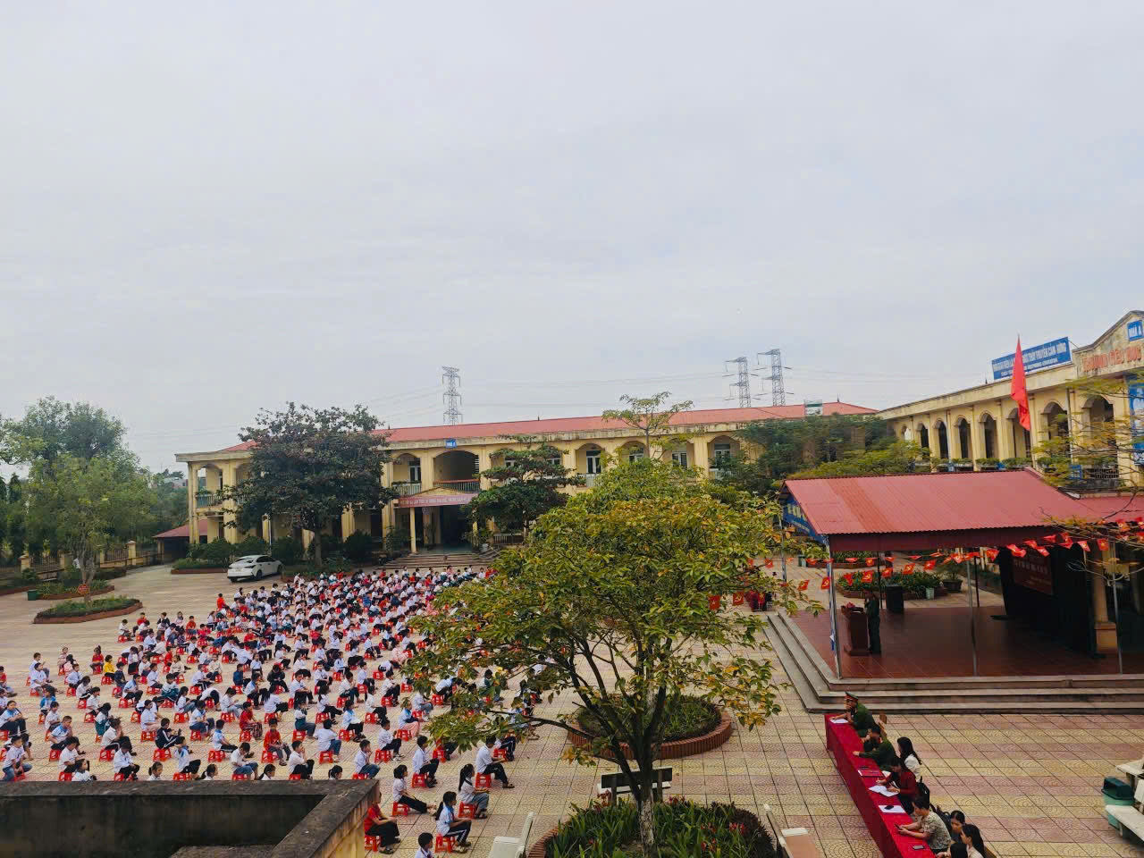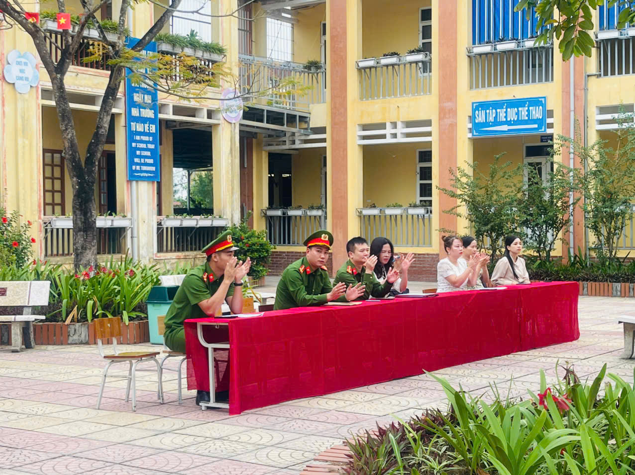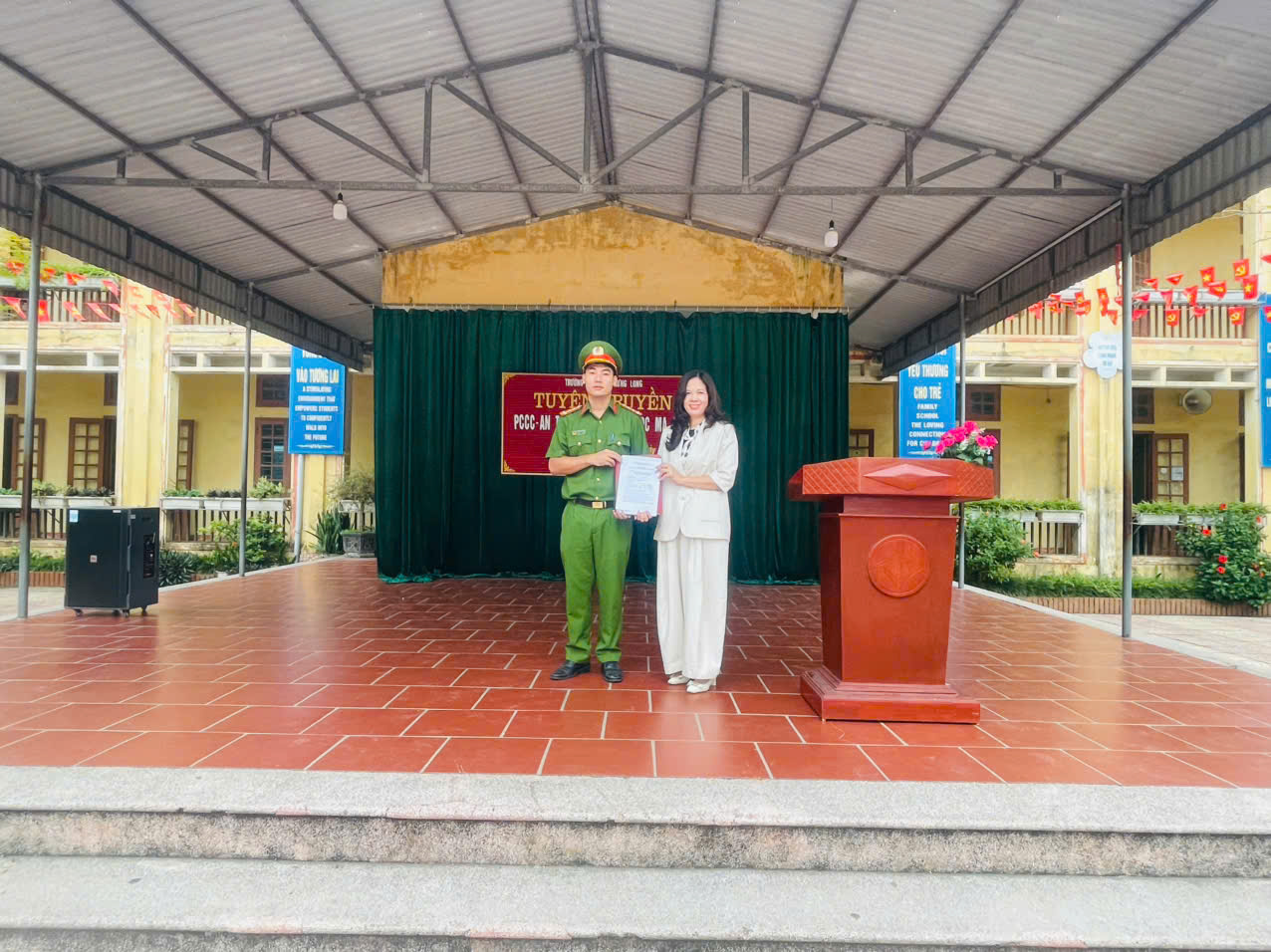 Đồng chí: Phạm Hữu Công - CB công an xã Hồng Châu tuyên truyền về hiểm họa ma túy tới toàn bộ giáo viên và học sinh của trường;