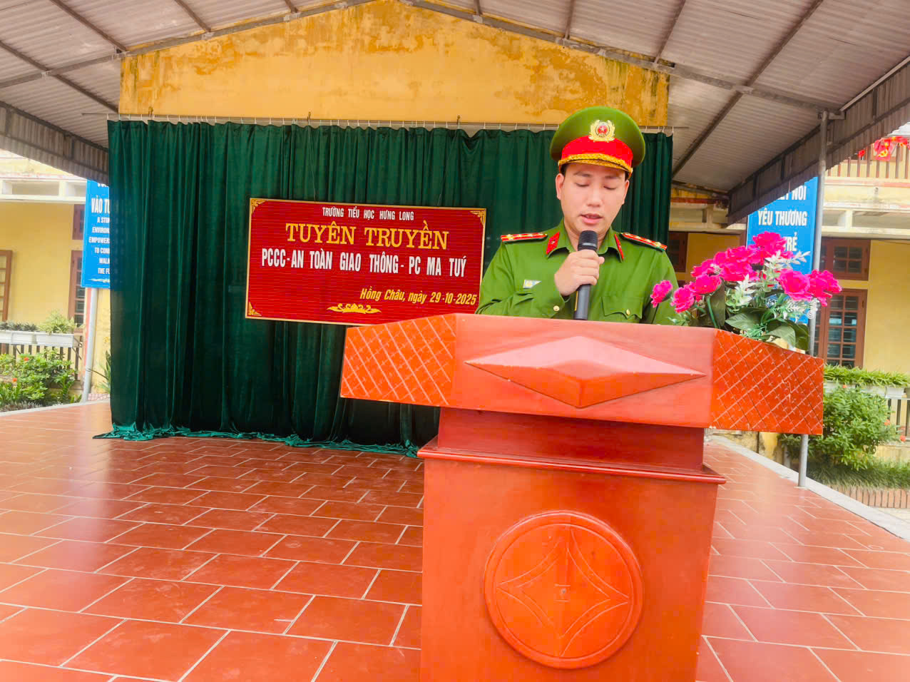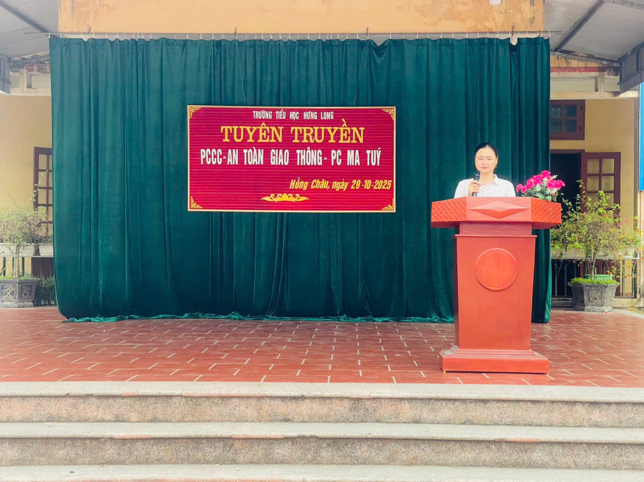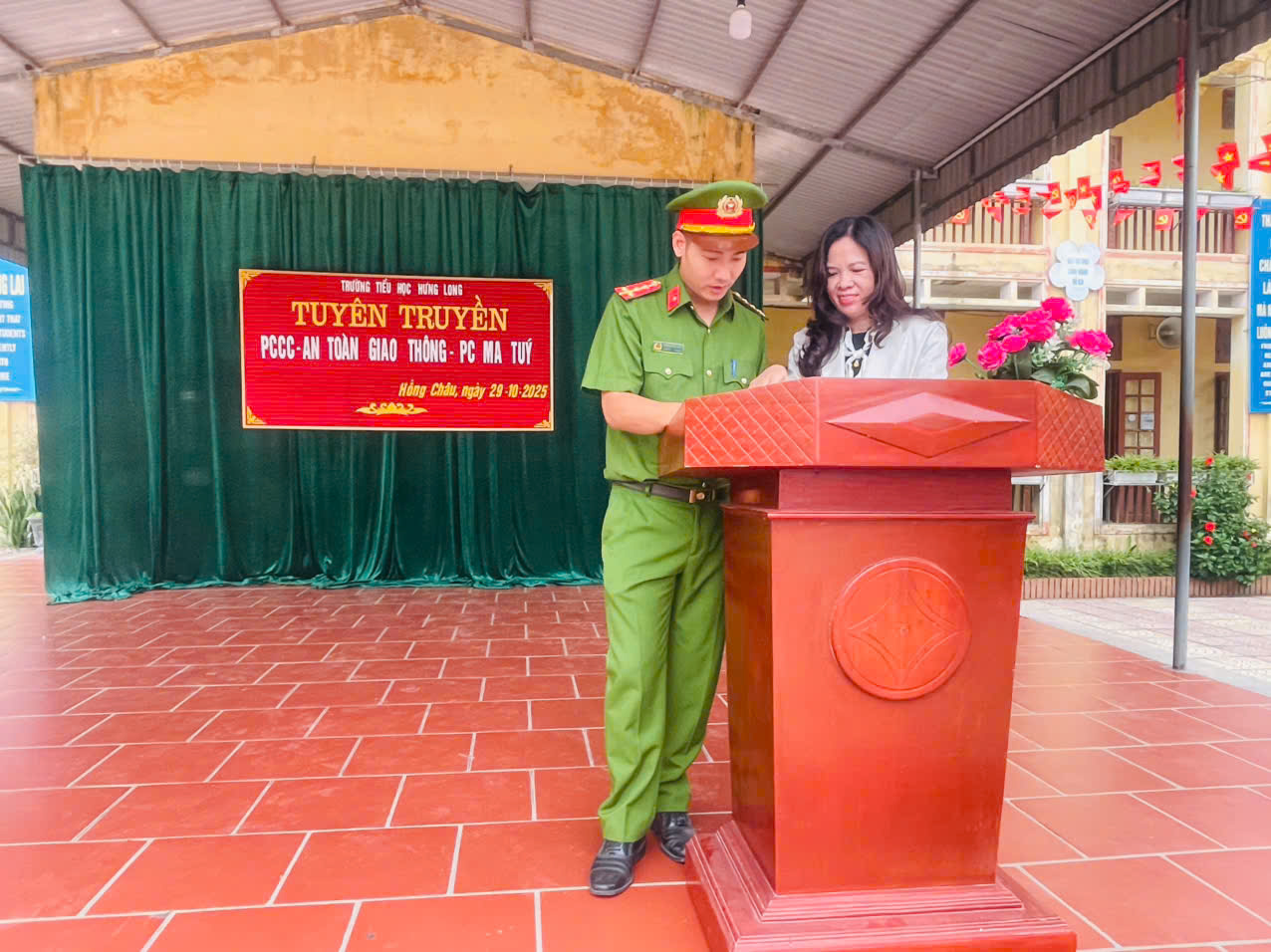 Thực hiện theo kế hoạch tuyên truyền giáo dục pháp luật về ATGT và ma túy học đường của Công an xã Hồng Châu, sáng ngày 29 tháng 10 năm 2025 cán bộ công xã Hồng Châu đã về Trường Tiểu học Hưng Long tổ chức buổi tuyên truyền về An toàn giao thông và phòng, chống ma túy học đường tới toàn bộ giáo viên và 403 em học sinh nhằm nâng cao nhận thức, trách nhiệm của mỗi học sinh trong việc chấp hành pháp luật và bảo vệ bản thân.
