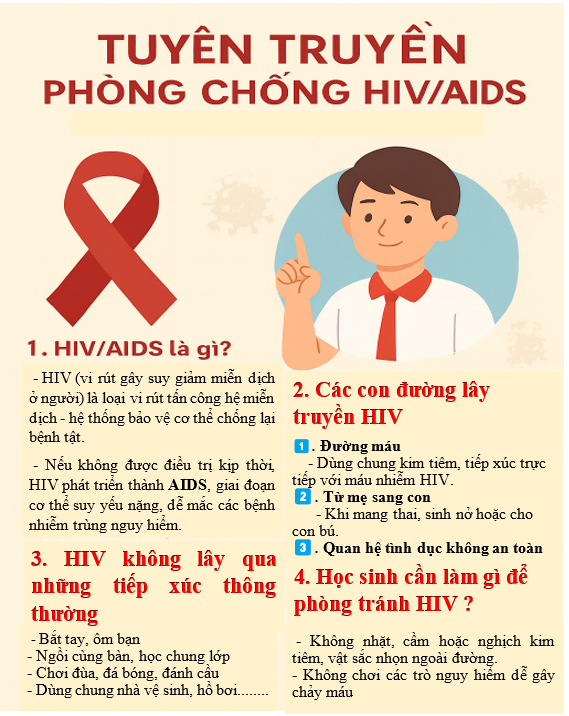 Hôm nay, cô Nguyễn Thị Mơ Tổng phụ trách Đội TNTP xin gửi đến các em một bài tuyên truyền rất quan trọng về phòng chống HIV/AIDS – một bệnh nguy hiểm nhưng hoàn toàn có thể phòng tránh được nếu chúng ta hiểu đúng và biết cách bảo vệ bản thân.