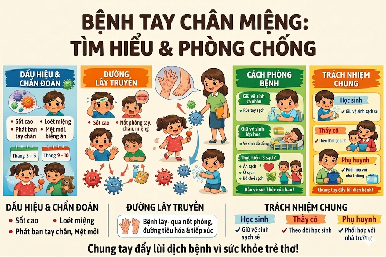 Trước tình hình bệnh Tay chân miệng đang có xu hướng gia tăng nhanh và có nguy cơ bùng phát thành dịch, đặc biệt là trong lứa tuổi tiểu học, nhà trường xin cập nhật các thông tin quan trọng để phụ huynh và học sinh cùng phối hợp thực hiện.